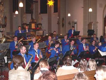 Das Blasorchester der KG Blau-Weiß Fischenich unter Leitung von Gerd Außem beim Weihnachtskonzert in der bis auf den letzten Platz gefüllten Pfarrkirche St. Karharina in Alt-Hürth.